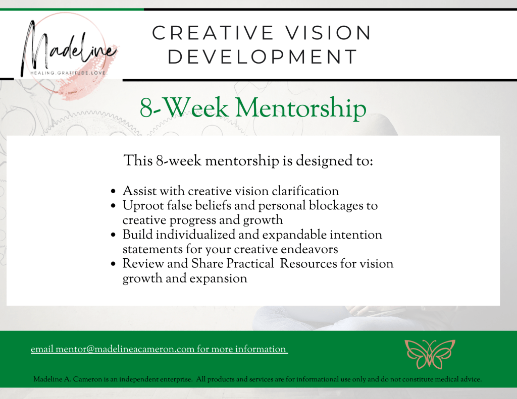 This mentorship is best suited for personal and professional development. This mentorship includes a 90-minute virtual meeting, weekly follow-up email and “Your Vision Is Vital” Workbook. Limit one mentorship per year.